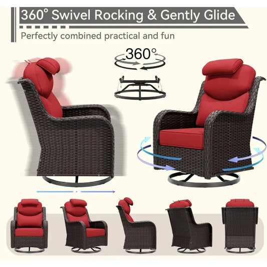 3 Pieces High Back Outdoor Swivel Rocking Chairs Set, 4" Thick Seat Cushions - Patio Furniture Set with Side Table, Headrest
