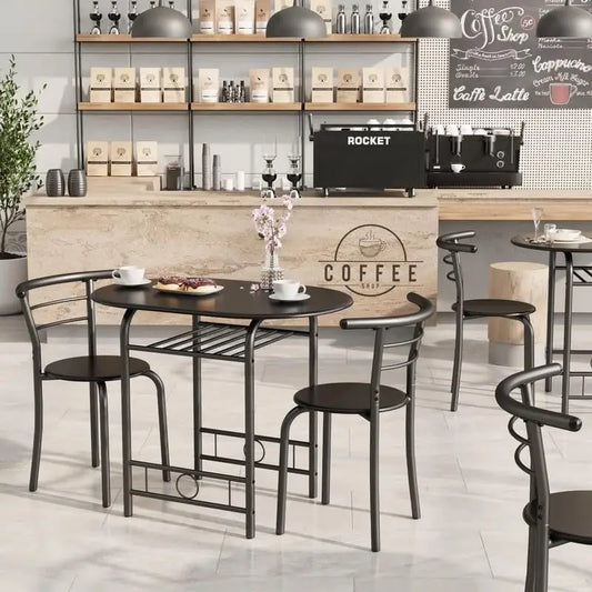 3-Piece Wooden Round Table & Chair Set, Space Saving Kitchen Breakfast Nook Wood Grain Tabletop With Metal Frame