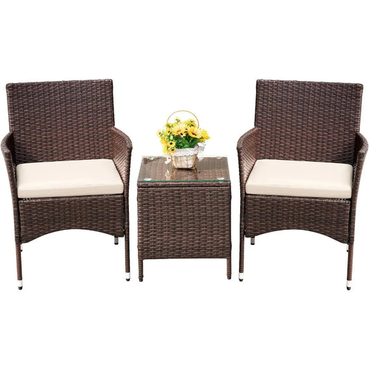 Patio Porch Furniture Sets 3 Pieces PE Rattan Wicker Chairs with Table Outdoor Garden Furniture Sets (Brown/Beige)
