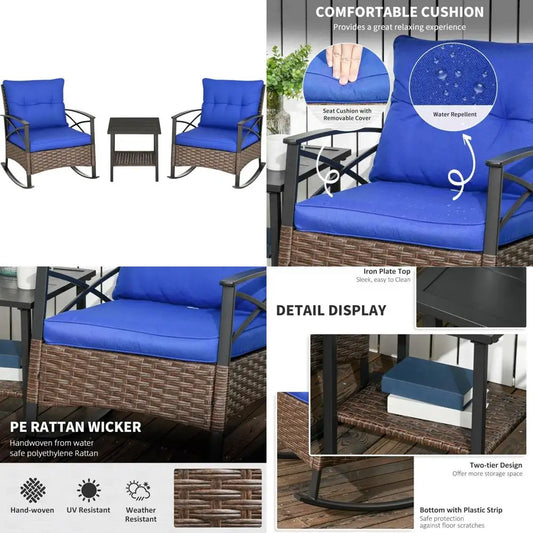 Patio Rocking Chair Set Outdoor Wicker Bistro with Cushioned Rockers and 2 Tier Coffee Table for Garden Relaxation