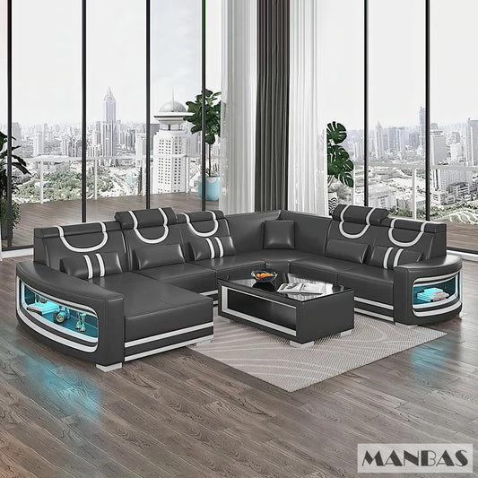 Upgrade Your Living Room with MANBAS Italian Genuine Leather Sofa - 2 Colors Combination, LED Light & Soft Cushions