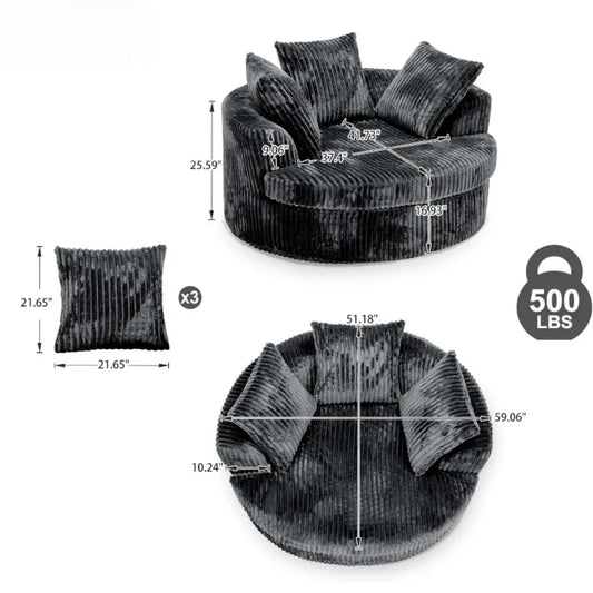 59 Inch Oversized Chaise Lounge Chair Indoor, Round Corduroy Chaise Lounge Sofa Bed with Throw Pillows and Backrest, Plush Sleep
