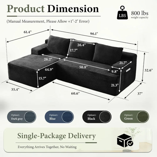96” L-Shape Memory Foam Sectional Sofa 3 Seat Modular Couch for Living Room - Extra Long Comfortable Couch for Large Spaces