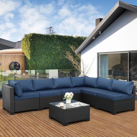 black rattan outdoor 7-piece wicker furniture set with navy blue washable cushions for patio sectional sofa