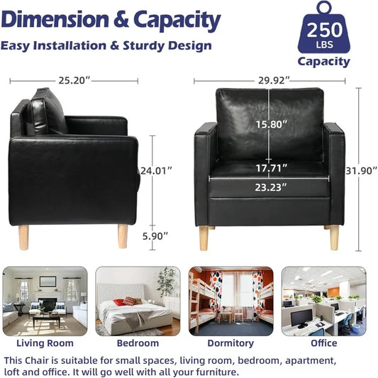 Black Faux Leather Accent Chairs Set of 2 Small Living Room Bedroom Chairs, Comfy Reading Chair Single Sofa for Adults,