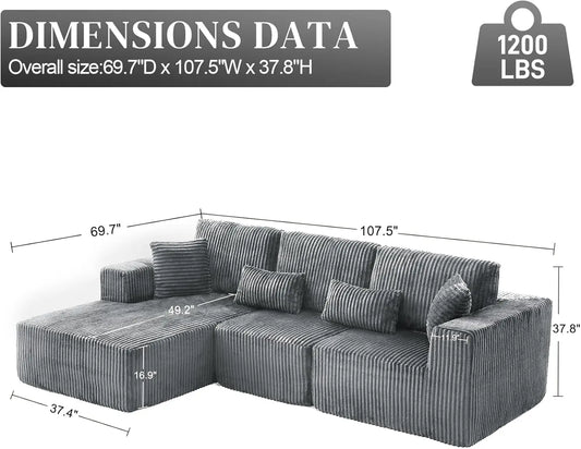 Cloud Sectional Couch, Boneless Sofa for Living Room, Corduroy Modular Couch with L Shape Chaise, Modern Compressed Sofa in a Bo