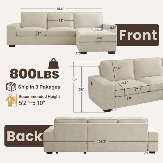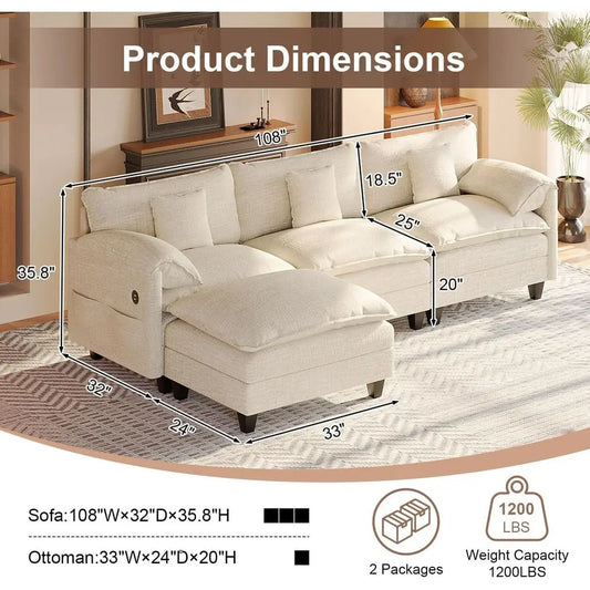 108 L-Shaped Chenille Sofa with Ottoman, Charging Station, Pockets & Pillows for Modern Living Rooms
