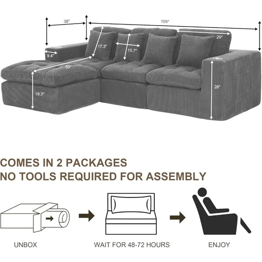 107" Boneless Couch with L Shaped Chaise, Plush Corduroy Sleeper Sectional Sofa, Deep Seat Comfy Couches for Living Room Bedroom