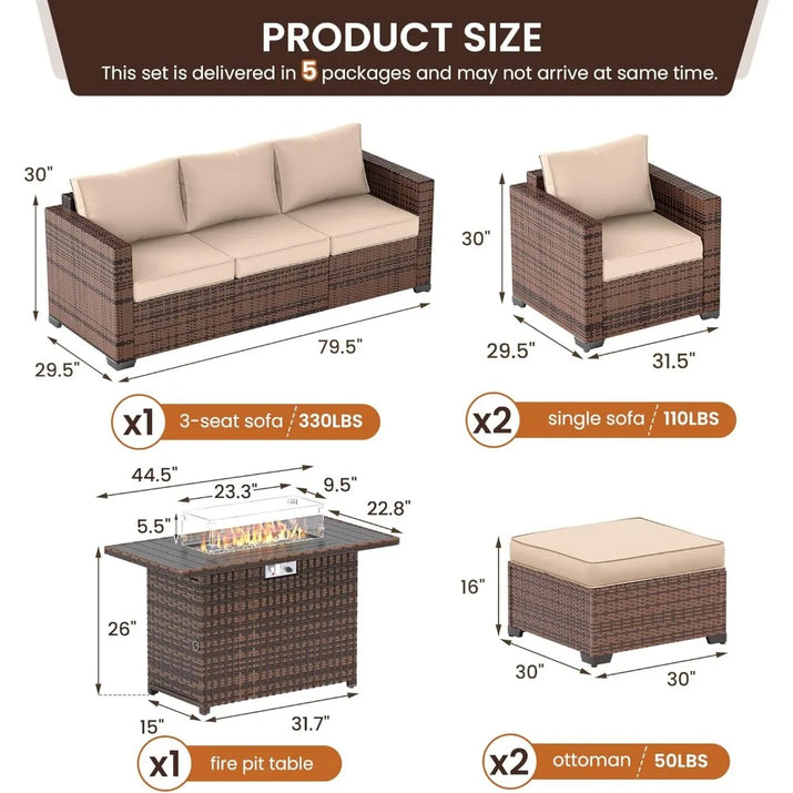 6-piece outdoor conversation sectional with 44" fire pit table and wicker rattan sofa