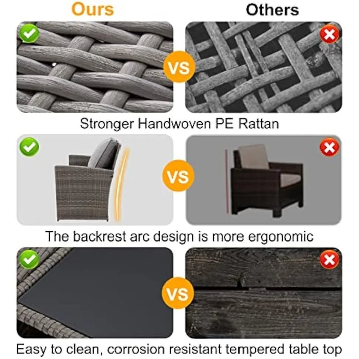 Answer 1: The patio furniture set is crafted from premium wicker rattan, which is designed to withstand various weather conditions, ensuring durability and easy maintenance over the years.