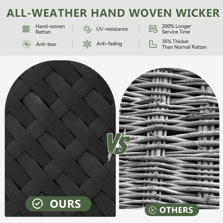 Answer 1: The patio furniture set is crafted from premium wicker rattan, which is designed to withstand various weather conditions, ensuring durability and easy maintenance over the years.
