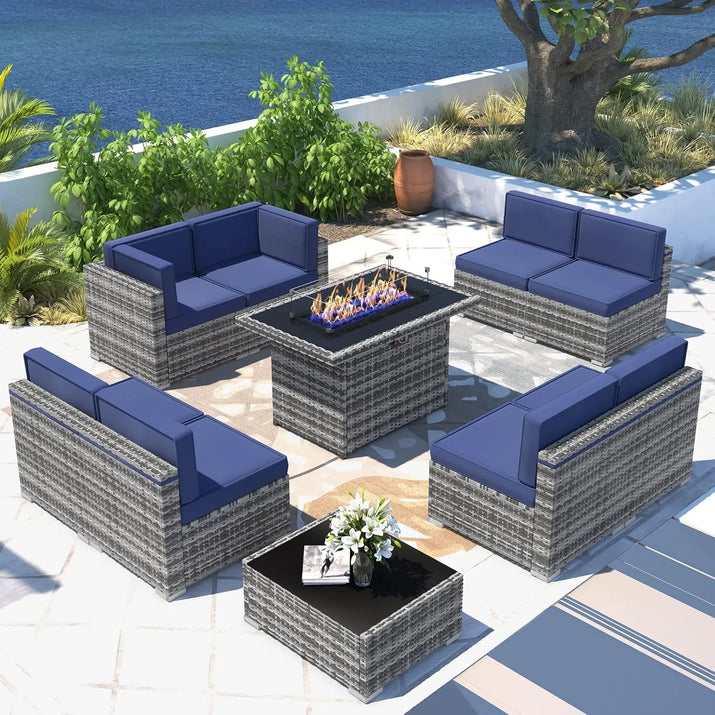 8 Pieces Patio Furniture Set with 44" Fire Pit Table, Outdoor Sectional Wicker Conversation Sofa Sets with Coffee Table