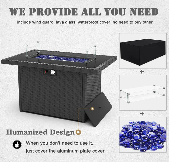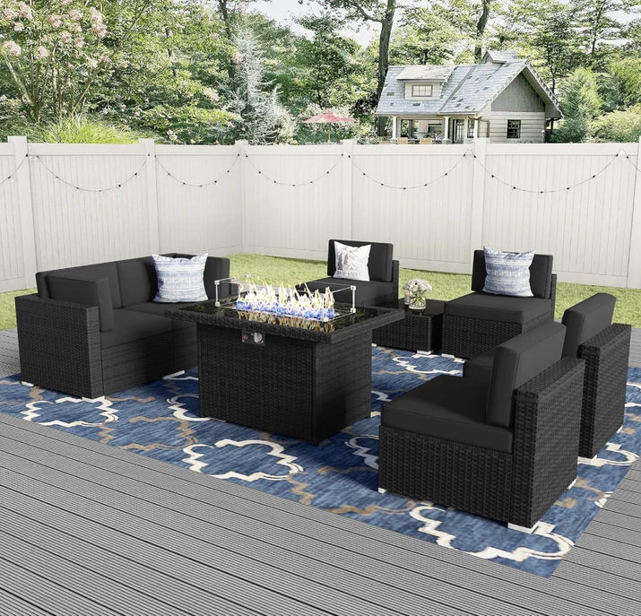 8 Pieces Patio Furniture Set with 44" Propane Gas Fire Pit Table, Outdoor Sectional Wicker Conversation Sofa Sets with Coffee Ta