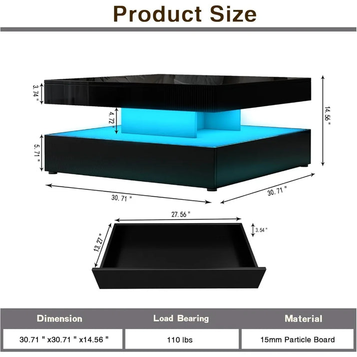LED Coffee Table for Living Room with Storage - High Glossy Modern White Center Table with 2 Drawers, Square Wooden Middle Tabl