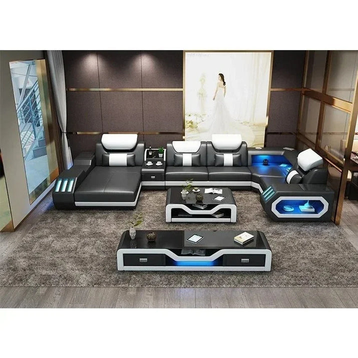 Modern LED Lighted Sofa Set with Recliner, Adjustable Headrest & Console | Luxury Leather Sectional Couch | Futuristic Furniture