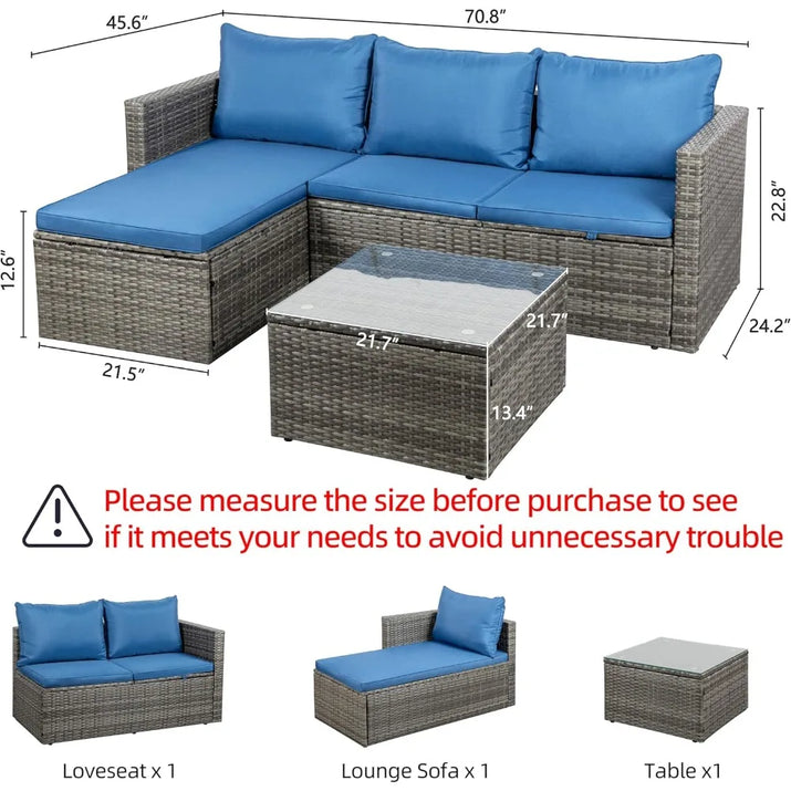 Outdoor Patio Furniture Sets, 3-Piece Patio Seating Sofas with Glass Coffee Table and Cushion, Garden Furniture Set