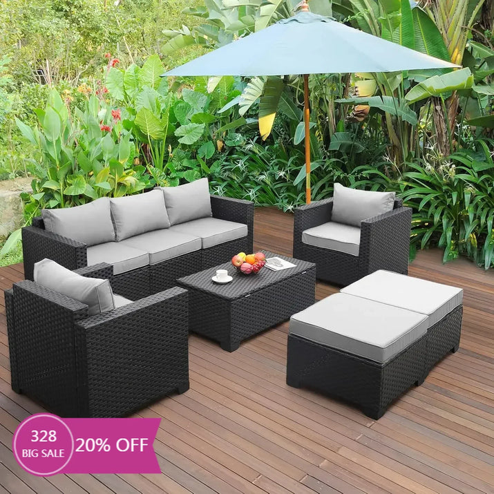 Patio Wicker Furniture Set 6 Pieces Outdoor PE Rattan Conversation Couch Sectional Chair Sofa Set with Grey Cushion