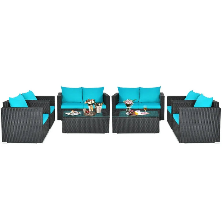 Turquoise Rattan Sofa Set with Cushions and Coffee Table - 8 Piece Patio Furniture