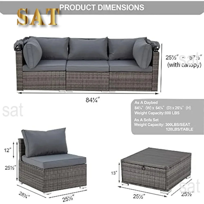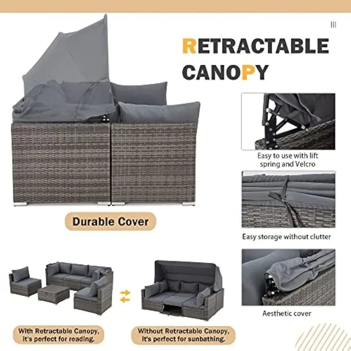 Y 6 Pieces Patio Furniture Sets, Rattan Daybed with Retractable Canopy, Outdoor Sectional Sofa Set with Adjustable Backrest