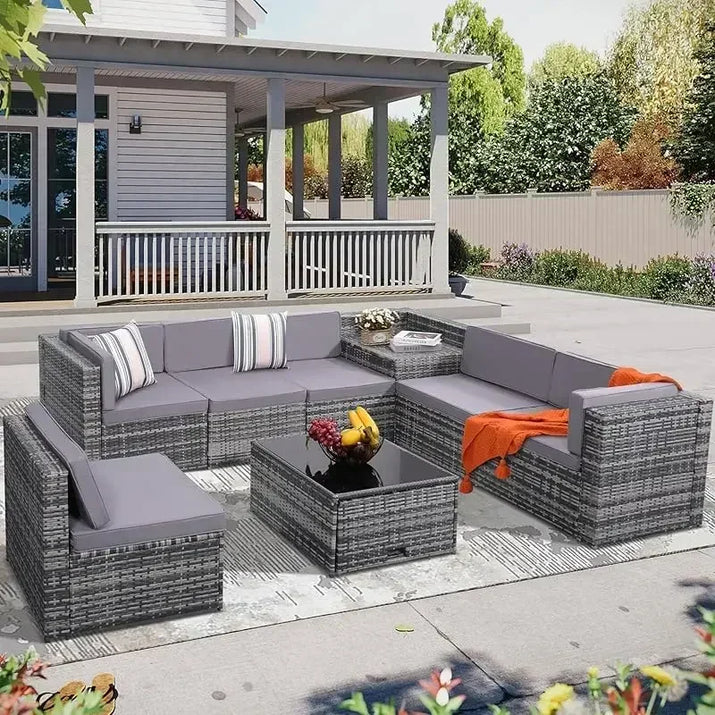 YND6-Q8 pieces outdoor Wicker rattan patio sectional furniture set.glass top table with hidden storage.7 sofa sections.oversized